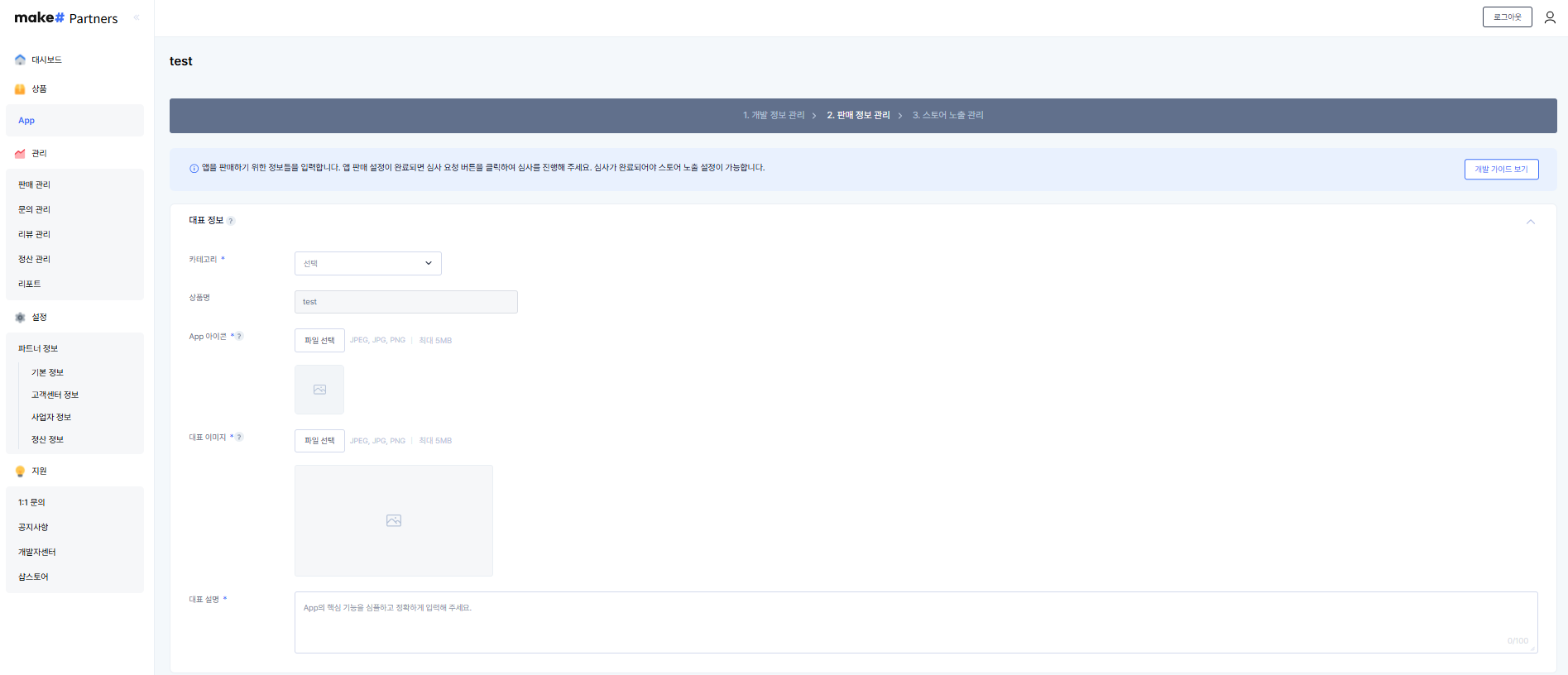 샵스토어에 노출될 APP의 상세 정보를 입력하는 단계입니다. 판매 정보 입력 완료 후 심사 요청이 가능합니다.